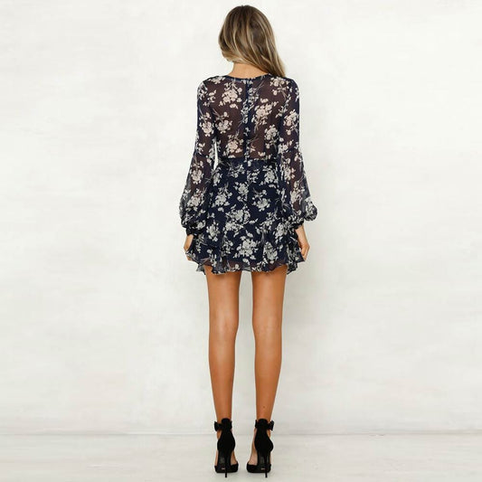 Vestido Corto Azul Primavera – Escote en V y Flores Azules Carlijne